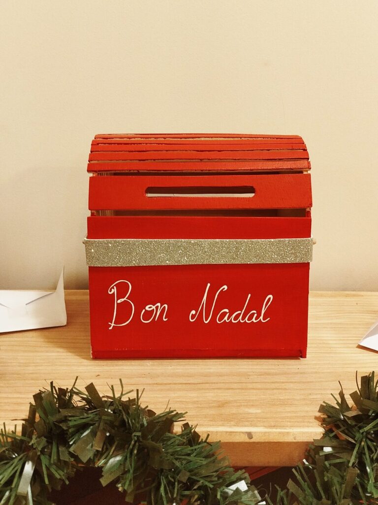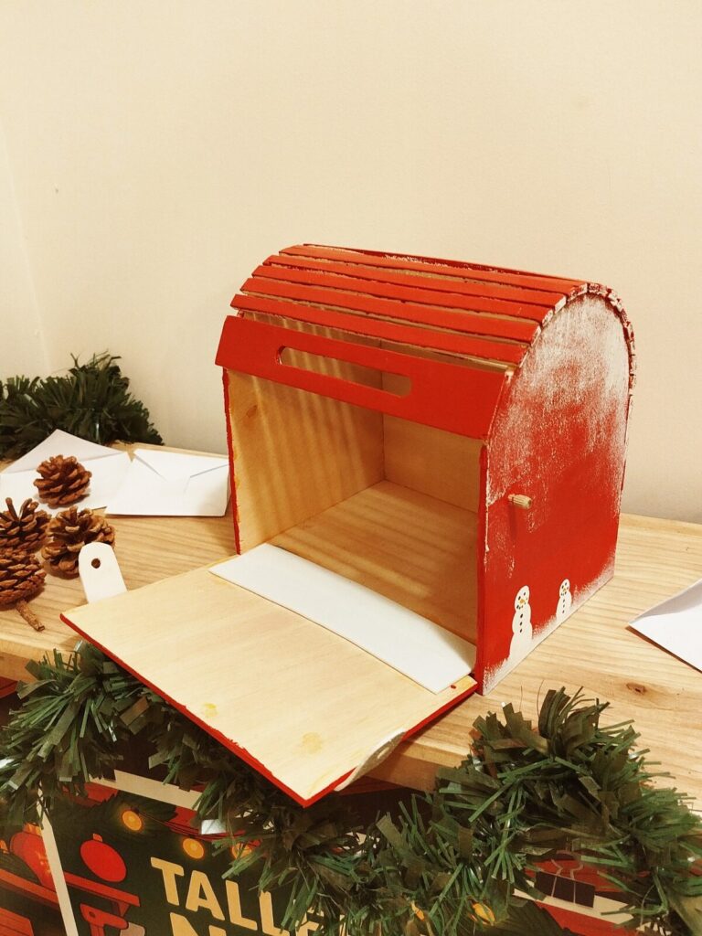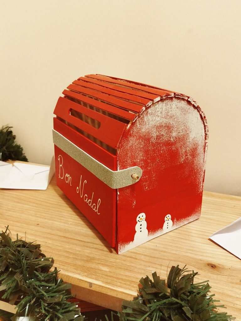 Una bústia de fusta pintada en vermell, amb obertura superior i decoracions nadalques. Un projecte divertit per a nens i nenes que volen tenir un lloc especial per deixar les seves cartes del Tió, dels Reis o del Pare Noel.